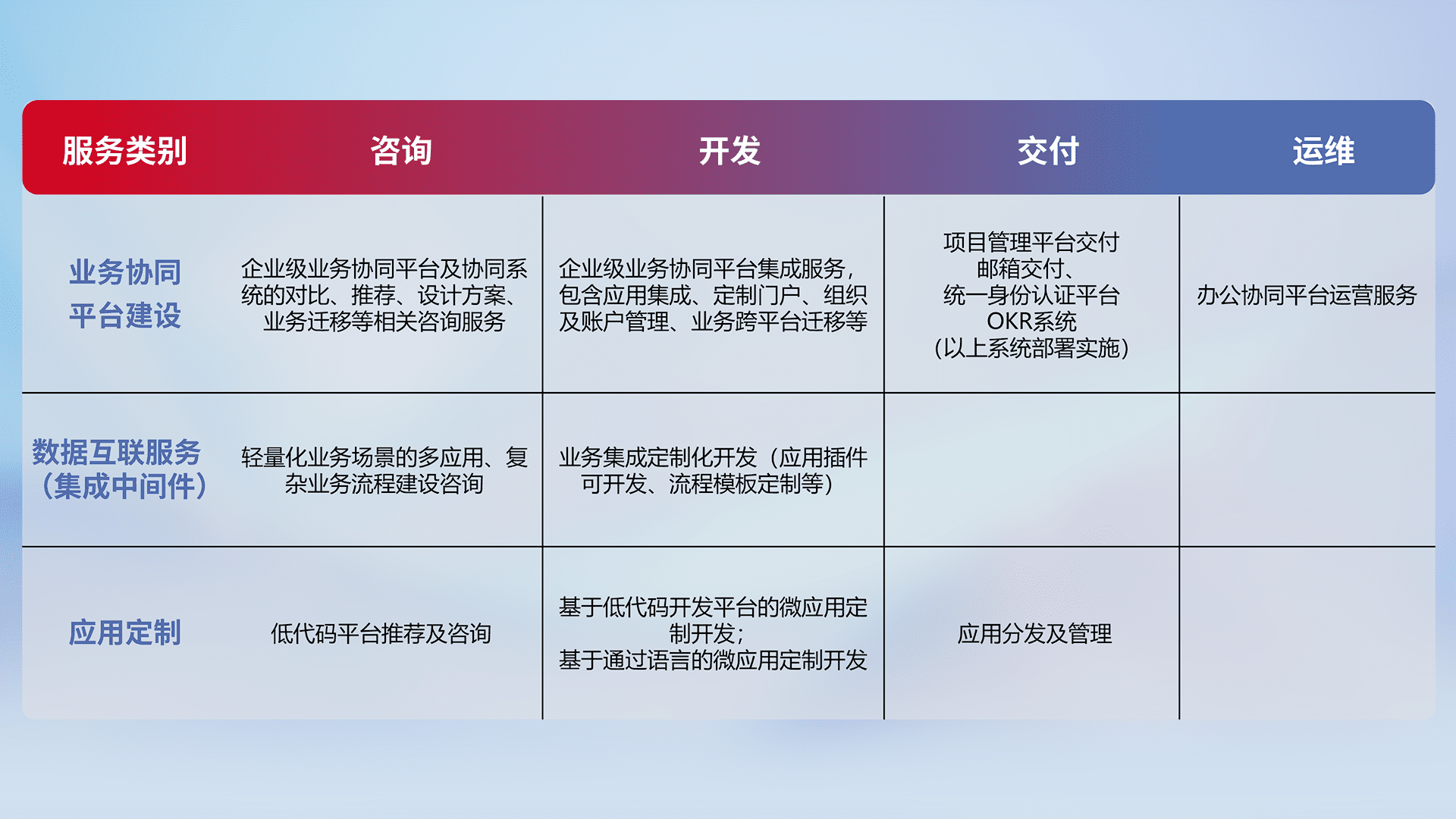 针对钉钉、、、企微、、IDaas等平台级产品提供产品的规划、、方案、、交付、、定制化开发等服务,,,实现如统一协同办公、、智能客户服务、、、混合会议管理、、、智能数据查询、、、、等业务场景,,实现数字化转型。。。