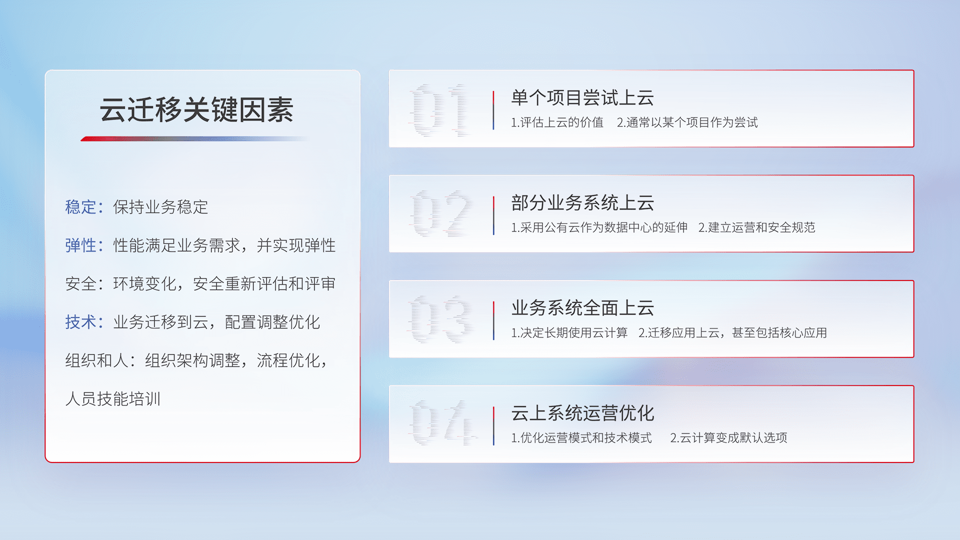 结合实际业务,,从规划设计、、、、云平台选型、、、云原生改造、、、数据迁移、、、、集成交付,,,,迁移全过程为客户识别最佳上云路径,,,,做好风险识别管理,,设计网络架构、、、身份权限、、安全审计合规、、操作审计、、、日志审计、、监控告警策略、、多站点容灾设计等,,,对云上基础设施进行整体规划,,提升IT治理水平,,,,以满足弹性、、高可用、、高性能的需求。。。。