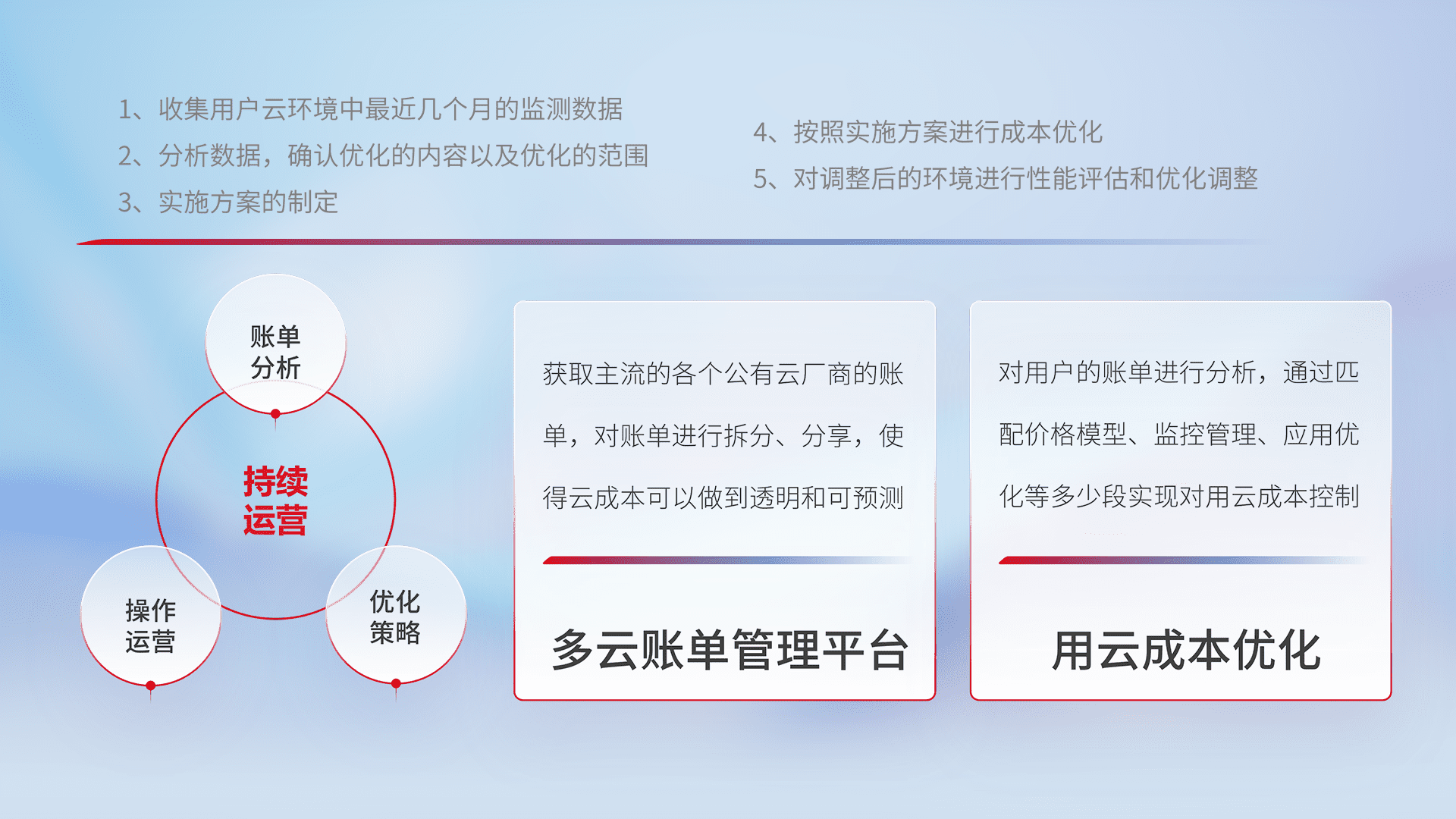 通过多云纳管,,以统一的资源数据模型把客户的云资源进行抽象和封装,,进而实现对多云资源的统一操作,,,保障云资源管理的可靠性、、稳定性与可用性。。。。量身定制化运维内容,,,配置、、、、开发运维、、补丁管理、、、、备份、、监控、、、、认证和访问管理、、、审计和日常巡检等,,,,保障在用云过程中的可靠度,,,稳定度以及高可用率。。。。