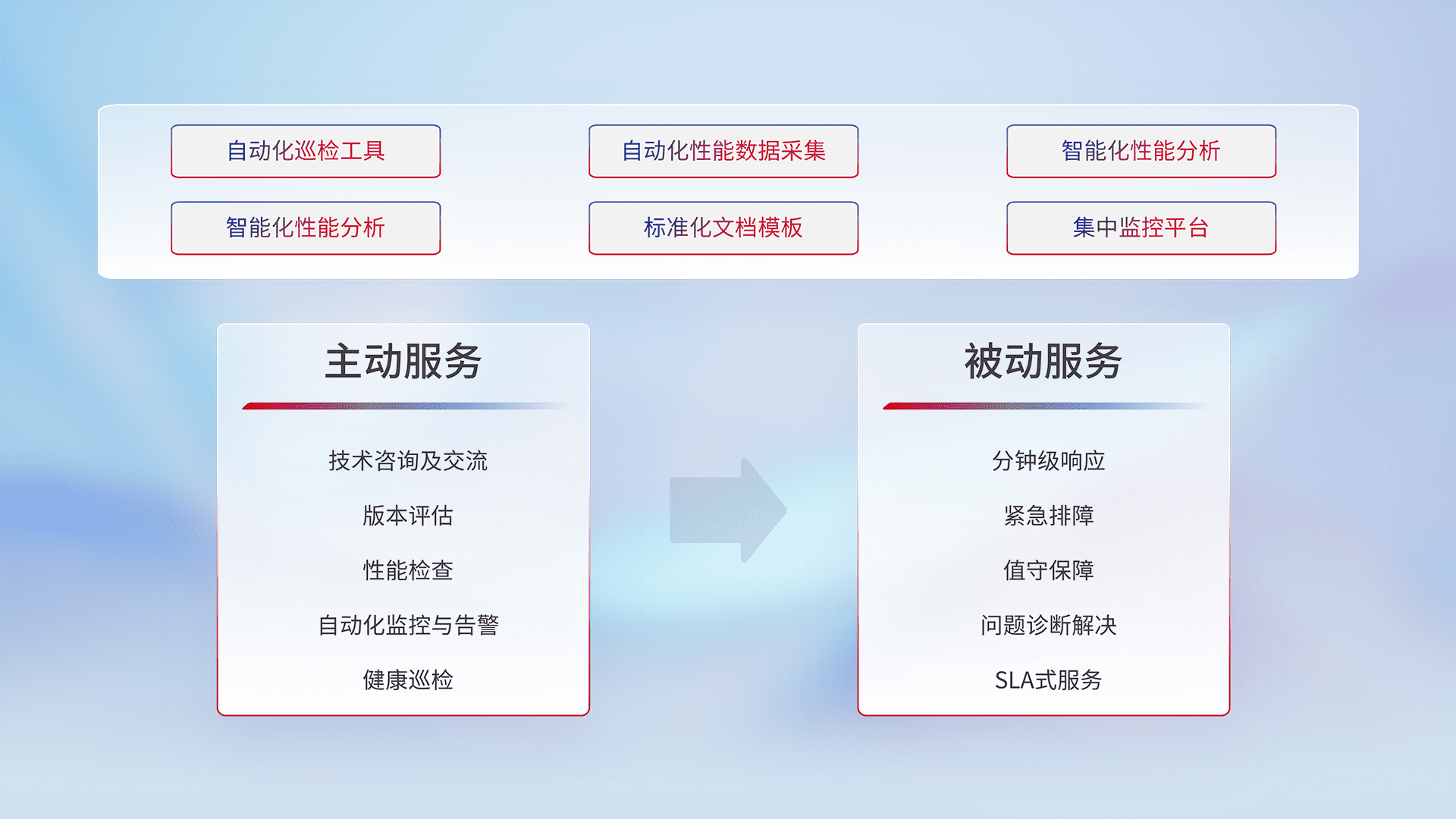 智能化工具和标准化文档,,保障服务质量,,提供主动服务(包含技术咨询、、、、版本评估、、、性能检查、、、、自动化监控与告警、、、健康巡检)和被动服务包含(分钟级响应、、、紧急排障、、、、值守保障、、、、问题诊断解决、、SLA服务)。。。。